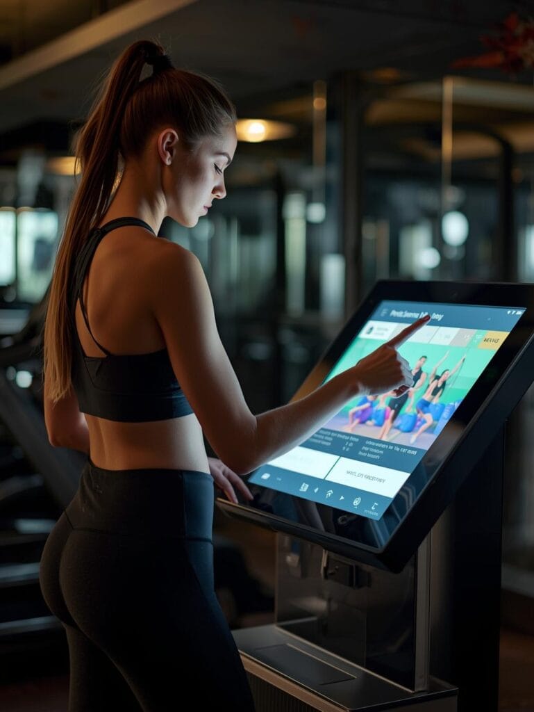 Interactive kiosks enabling members to view real-time class availability and book spots, watch exercise tutorials and proper form videos, track personal fitness progress, explore personal training packages, sign up for challenges, and access nutritional resources—keeping members engaged and motivated.