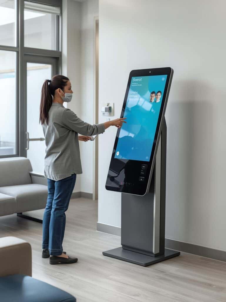 Interactive kiosks enabling patients to check-in digitally, view real-time wait times, watch patient education videos, explore treatment options, complete health forms, learn about wellness programs, and access provider information—reducing anxiety and empowering informed healthcare decisions.