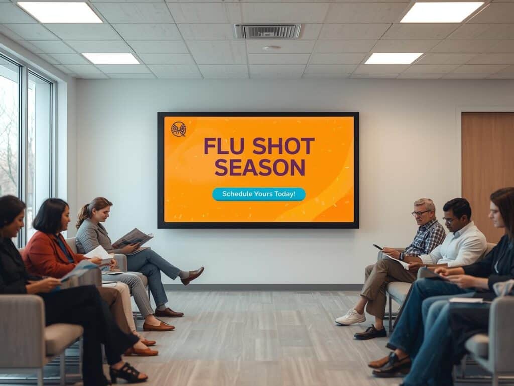 Calming, informative displays in waiting areas and exam rooms providing wellness tips, medication guidance, post-procedure instructions, seasonal campaigns (flu shots, cancer screenings), and condition-specific education that reassure patients and improve understanding of their health.