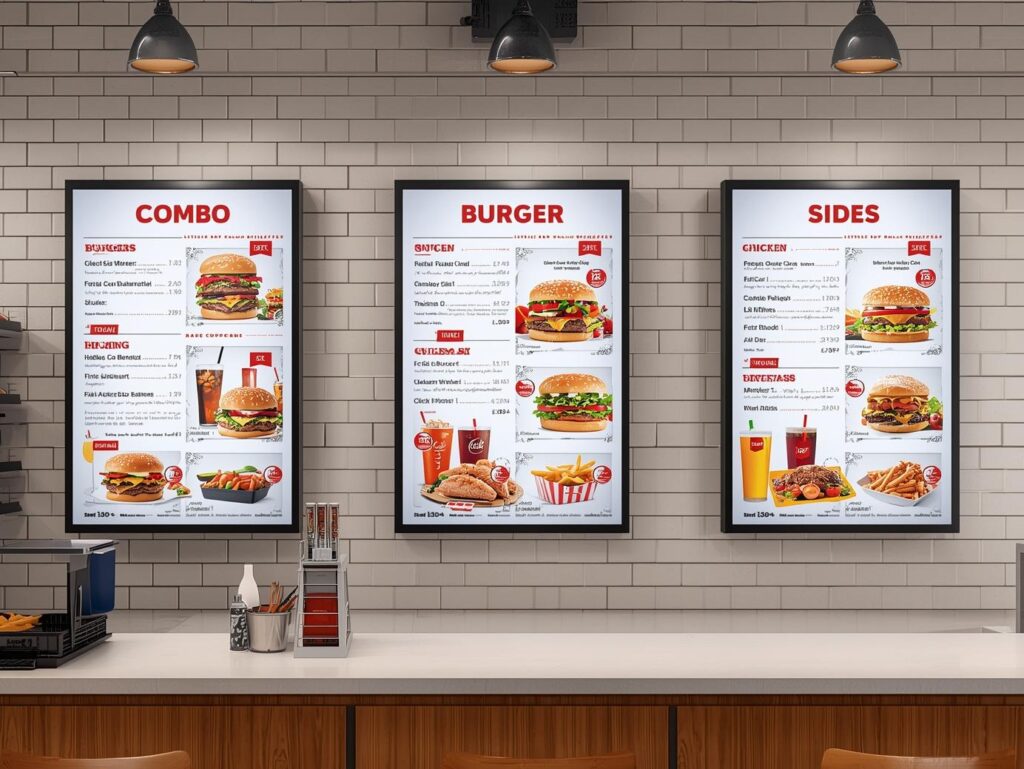 High-resolution displays with animated food photography, promotional videos, and real-time pricing that capture attention and drive impulse purchases.
