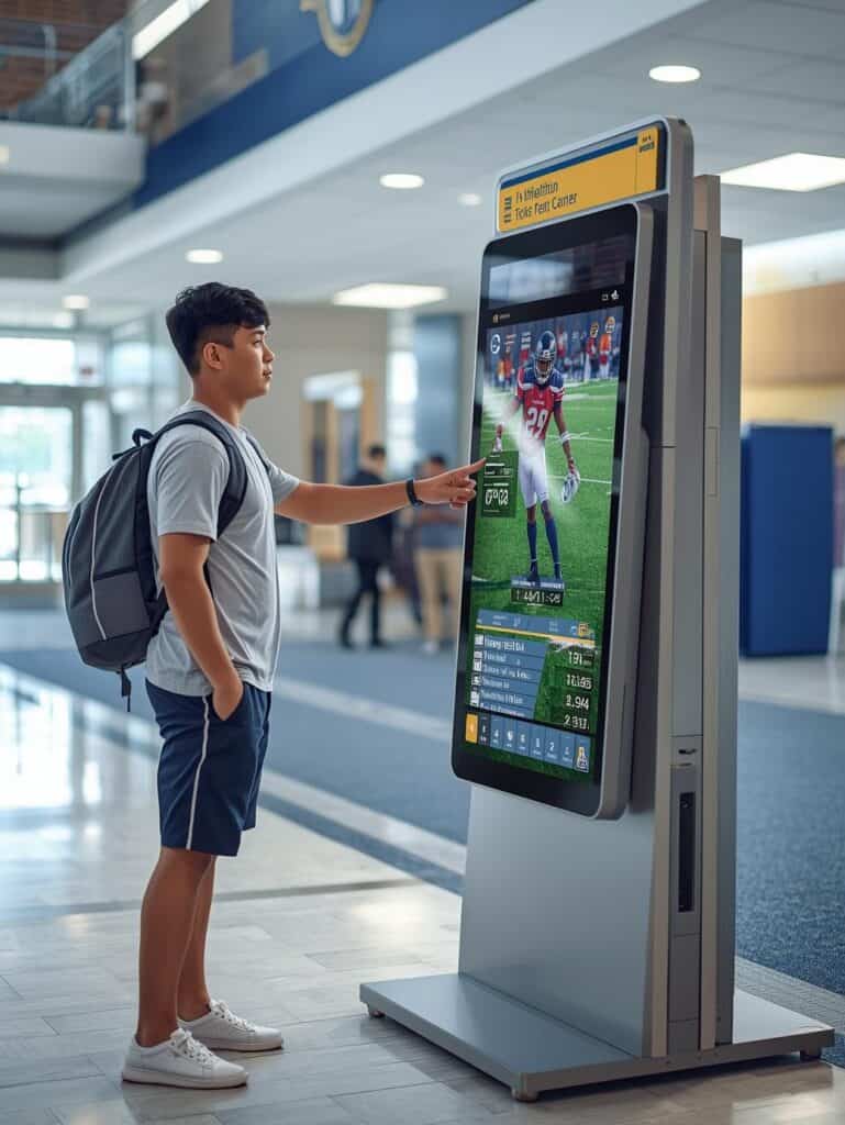Interactive touchscreens allowing fans to explore team rosters, watch game highlights, view player statistics, and learn about giving opportunities—creating memorable engagement experiences.